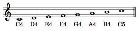 The tricky bit about this system is that the octave starts on C and ends on B. So an ascending scale from middle C contains the following pitch designations: